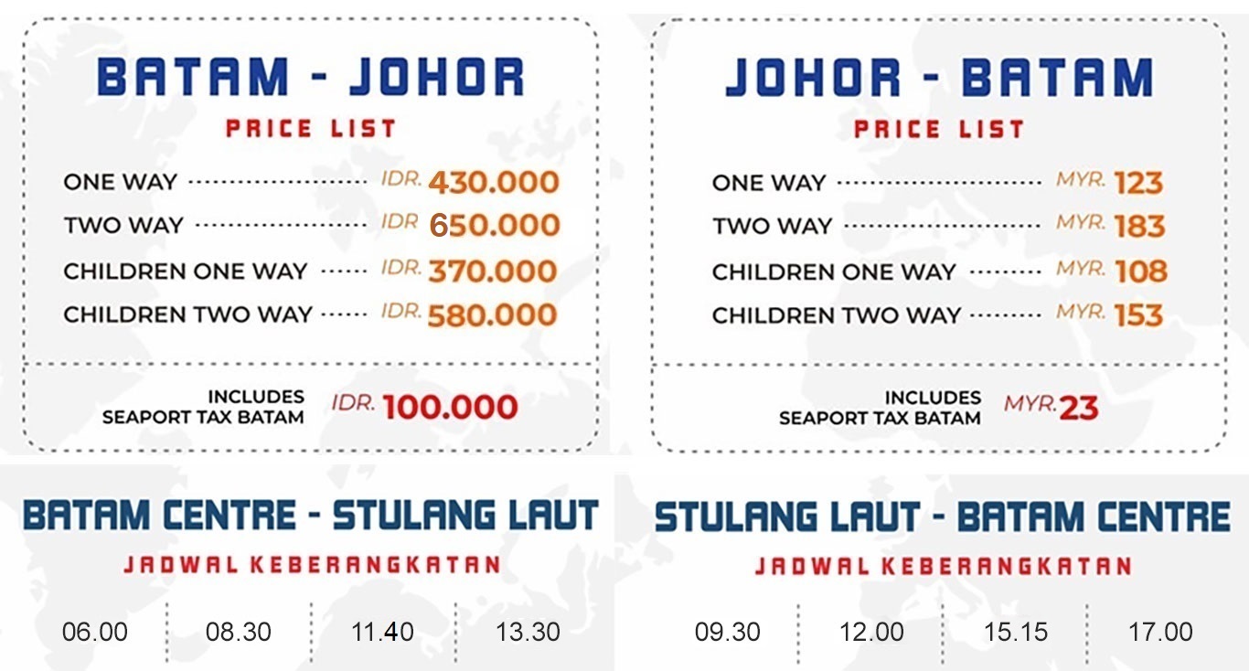 Sebagai informasi durasi perjalanan dari Terminal Ferry Internasional Batam Center ke Terminal Berjaya Waterfront Stulang Laut Malaysia sekitar 120 menit. Bagi calon penumpang yang akan menyebarang setidaknya datang ke Pelabuhan paling lambat satu jam sebelum kapal ferry berangkat.